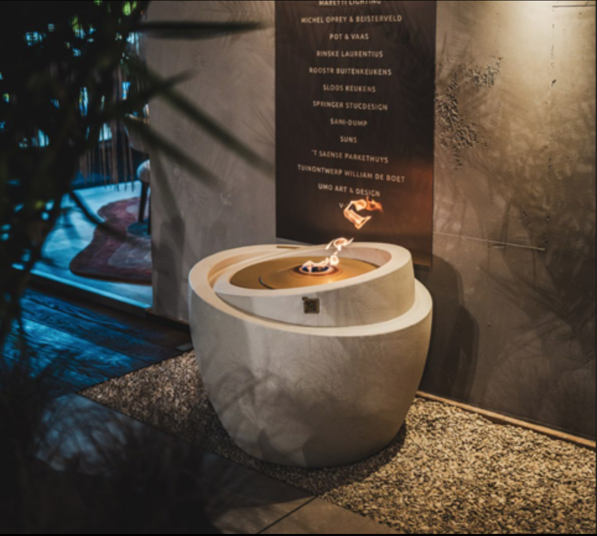 nuum by MOARA® is designed as an architectural sculpture — a freestanding fire object crafted from GRG, a non-combustible mineral composite known for its strength and refined texture.